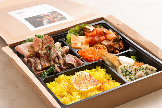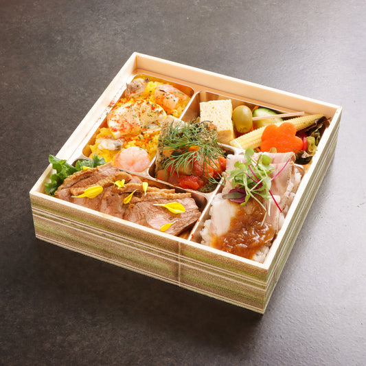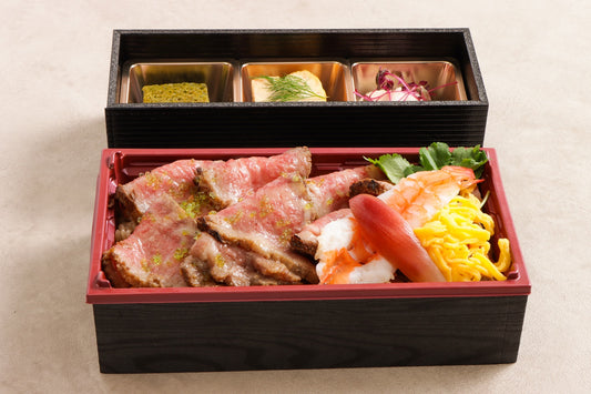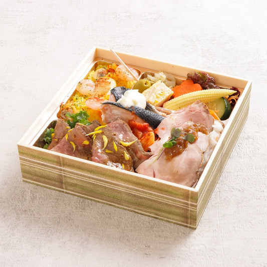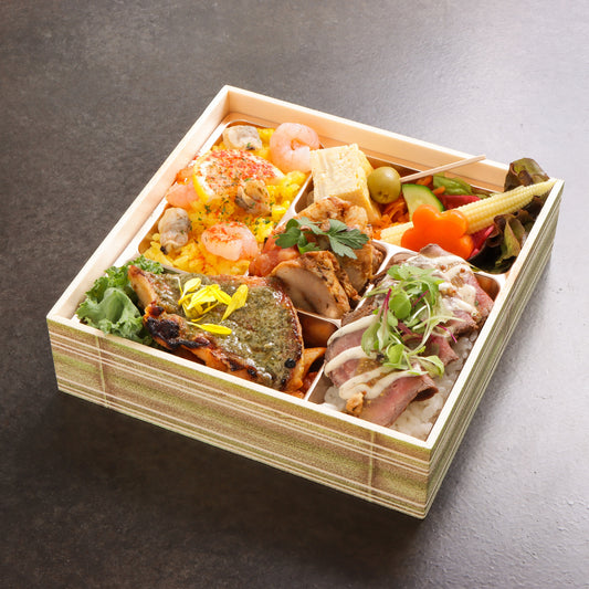 【2,010円】和牛麹漬けステーキ×サーモンヴァンブランソース×ハーブローストポーク(トリプルメイン弁当)