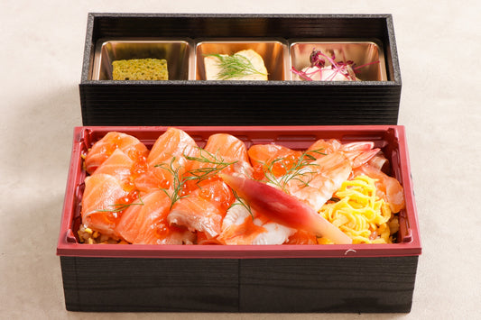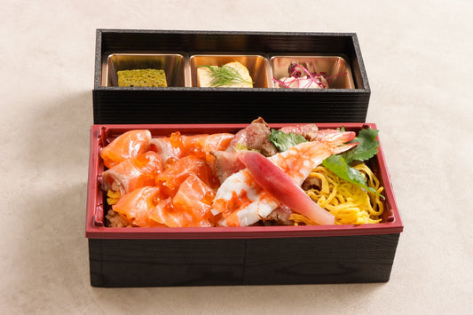 【2,800円】to-un-be醤油麹漬け焼き和牛ローストビーフ&ハーブマリネタスマニアサーモン バルサミコちらし寿司弁当(3種のミニ小鉢付き)