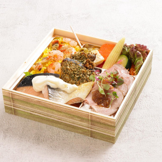 【1,800円】サーモンヴァンブランソース×天然鰤南仏風ハーブ焼き×ハーブローストポーク(トリプルメイン弁当)