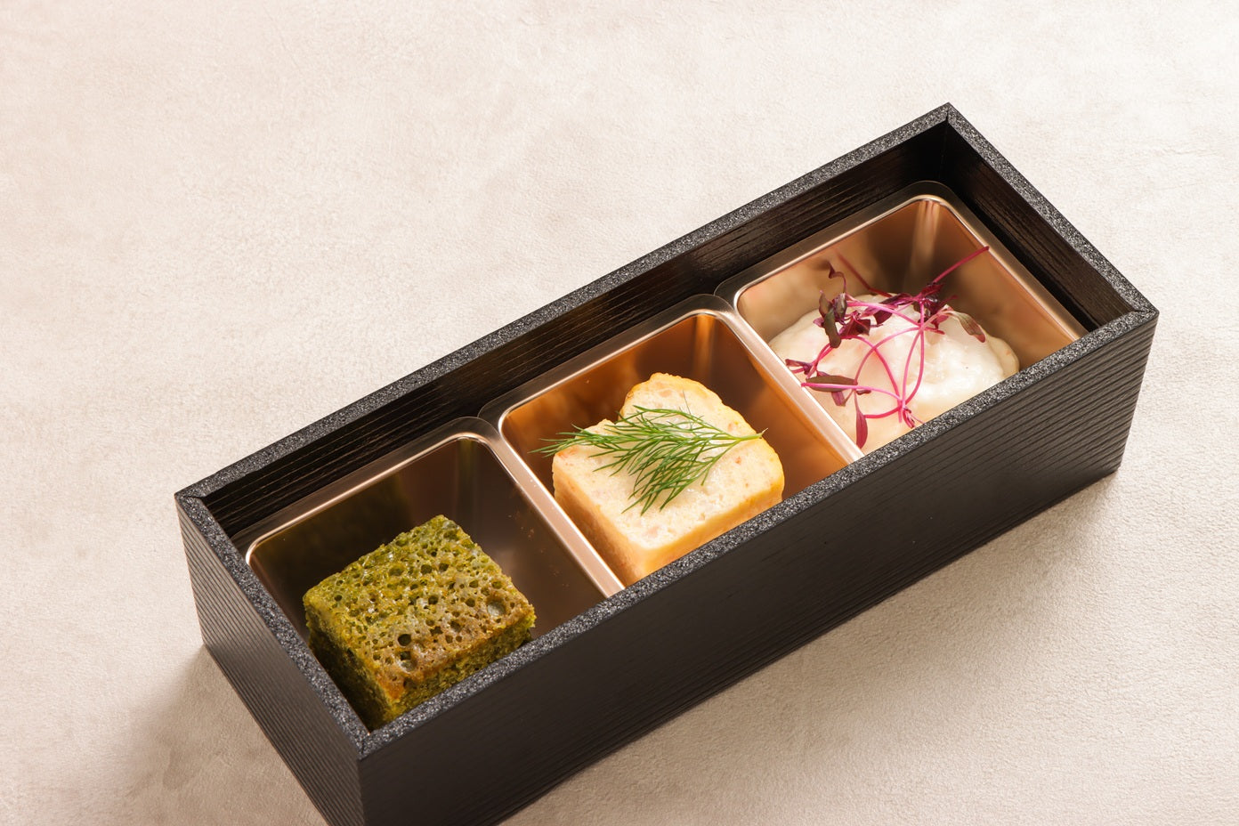 3種のミニ小鉢には、豊かなエビの旨みを溶け込ませた「エビオムレツ 真丈風」、クリーミーな「ズワイ蟹とジャガイモのアイオリ和え」、そして「抹茶ガトーショコラ」のデザートを詰め込みました。