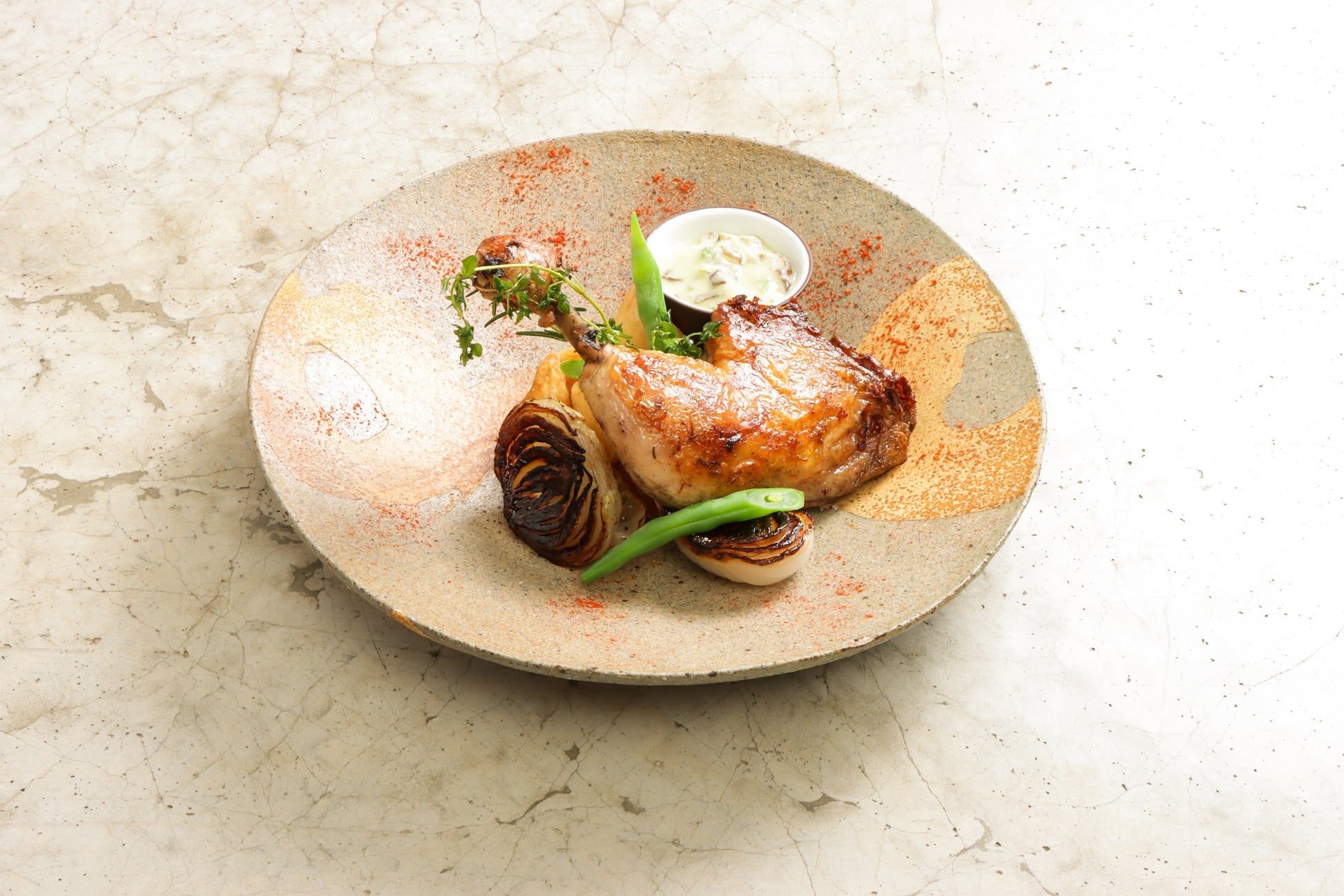 丹羽黒鶏の骨付き鶏もも肉のコンフィ 春野菜のソース