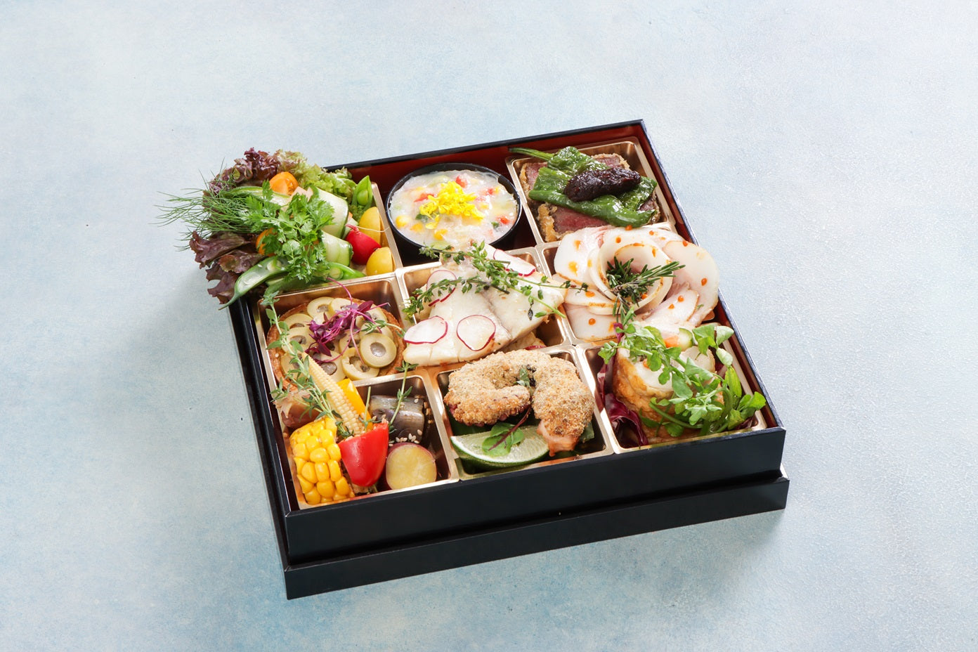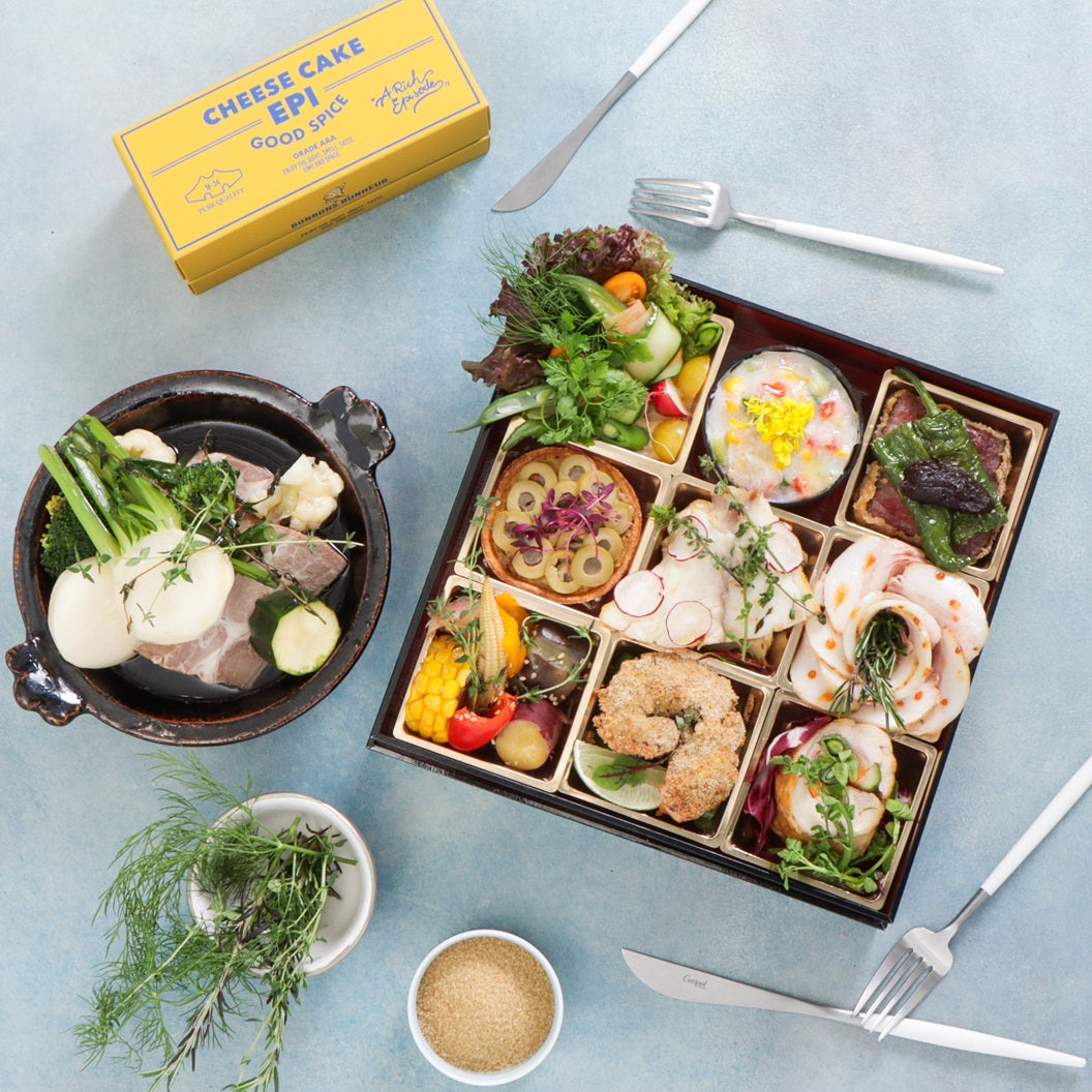「和」を基調としたモダンフレンチケータリングUN-BE LABから生まれる月替わり「to-un-be」オードブルとCHEESECAKE「EPI」のドルチェセット。