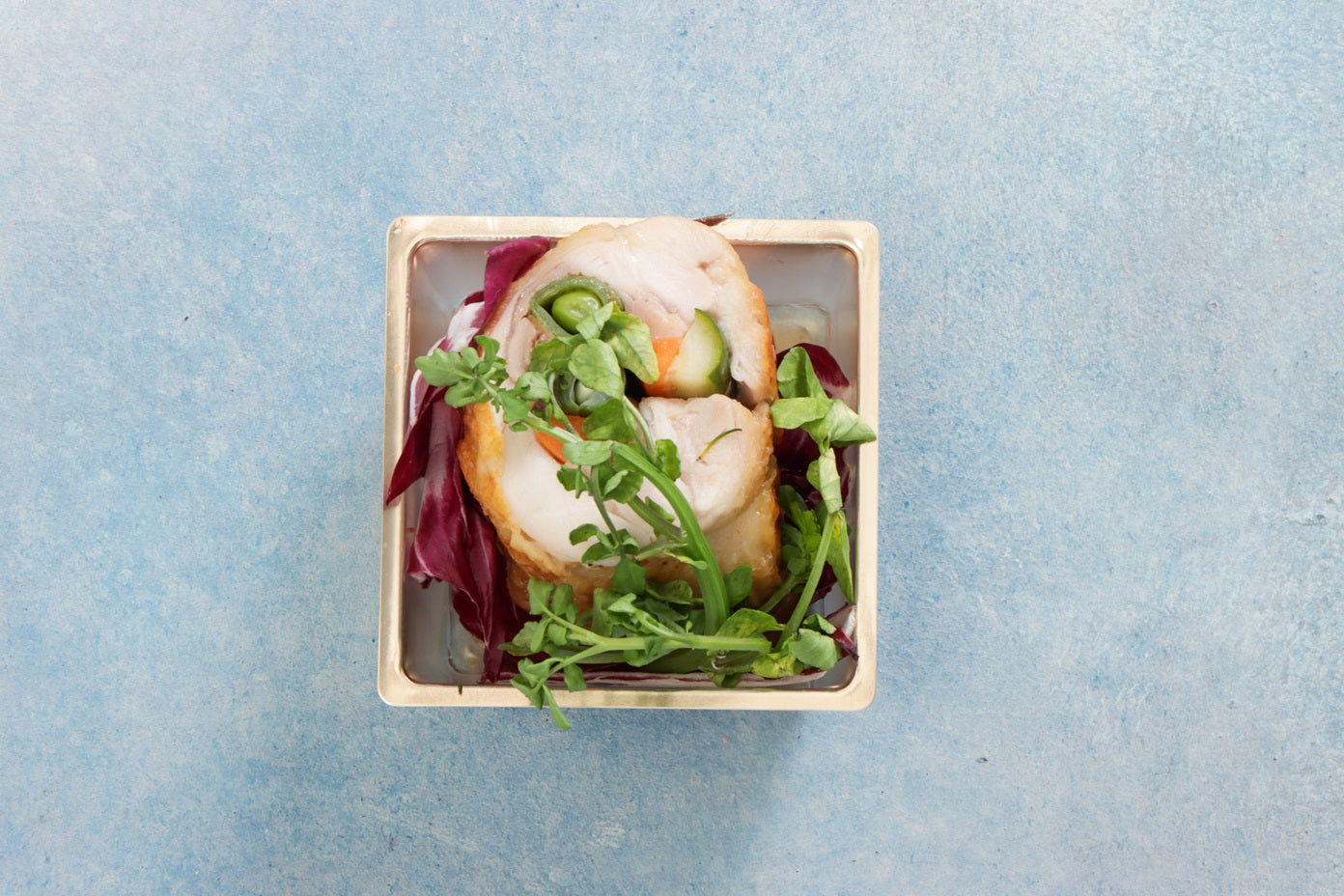 銘柄鶏と南仏のルーロー 和風ラケ:開いた鶏にアンチョビや初夏野菜を乗せて巻いて焼きました。ニースなどで食べられる鶏の軽い煮込みをモチーフに。