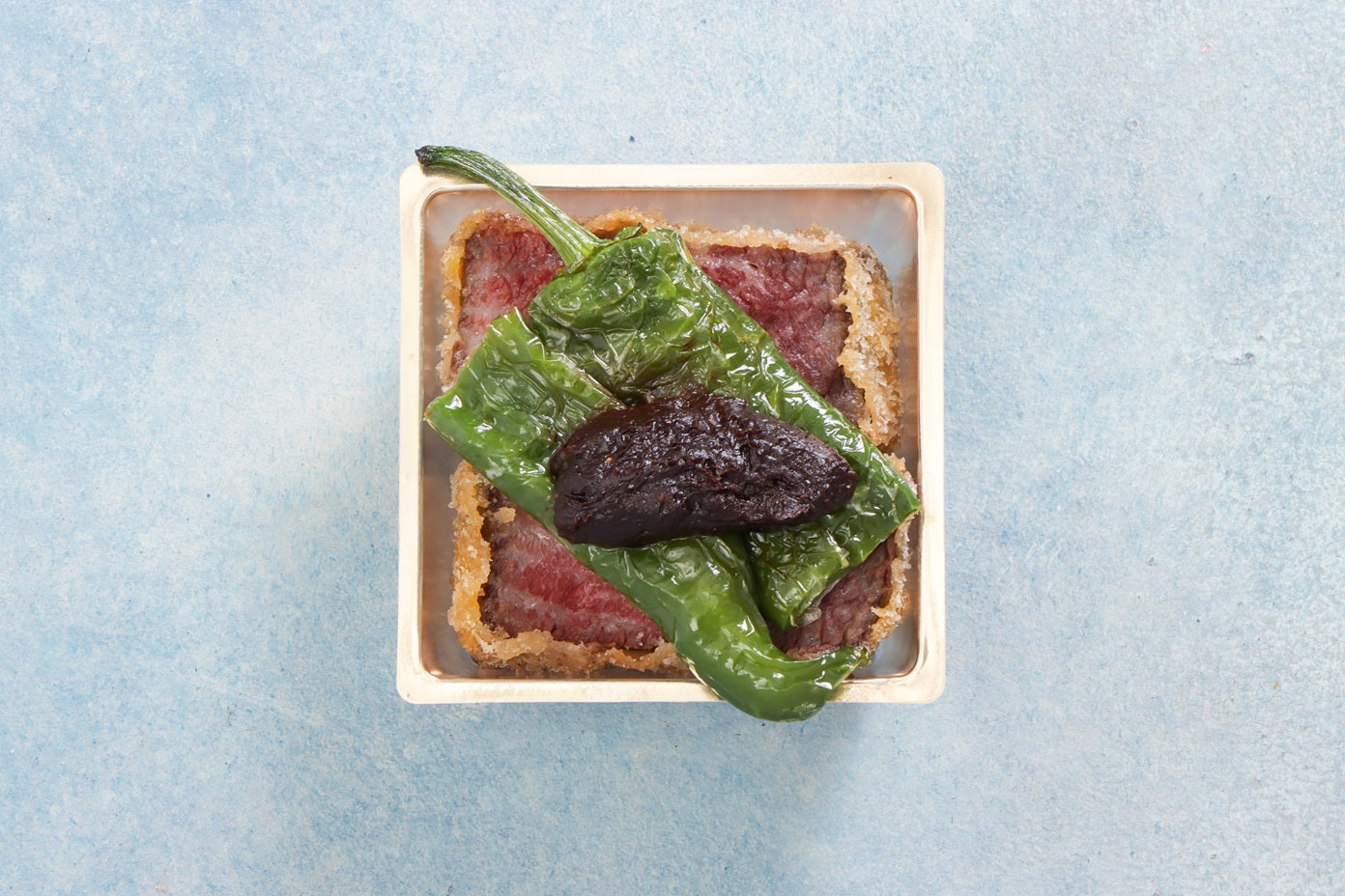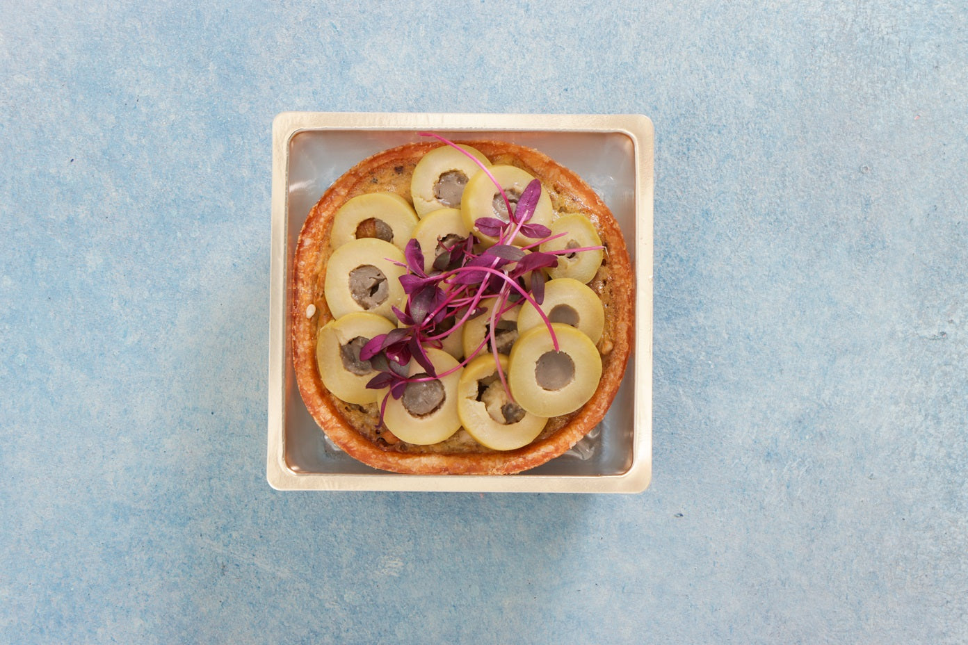 茄子とオリーブのキャビア風塩麹タルト:キャビアドオーベルジーヌというフランスのおつまみをタルトに。茄子に塩麹ソースを塗って焼き上げて叩いて卵黄と混ぜタルトに詰めて焼き上げました。