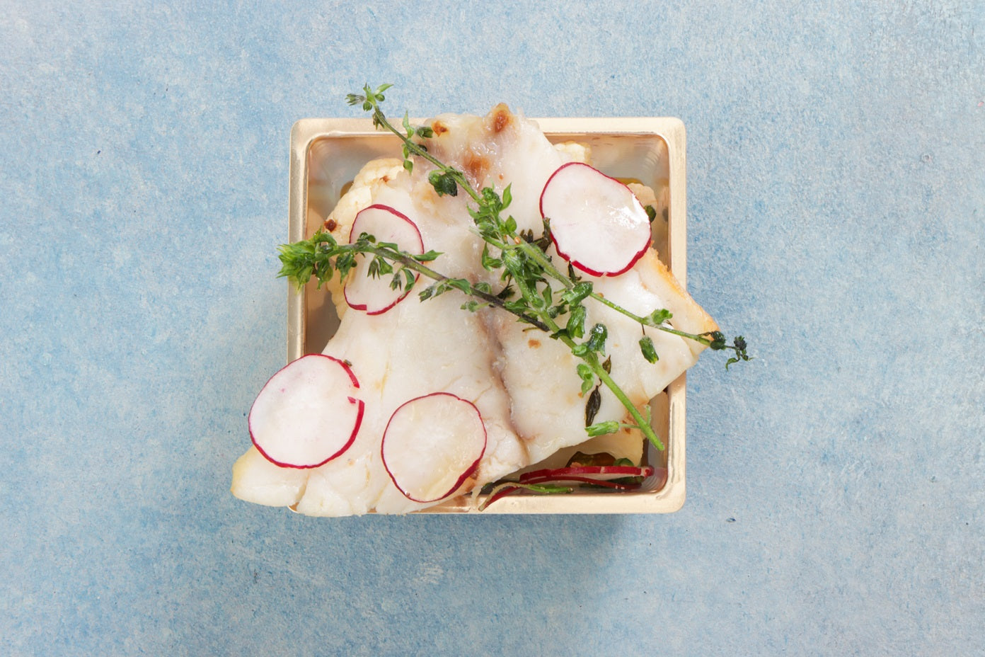 真鯛のピルピル風 紫蘇風味:フランス南西料理、ニンニクオイル煮 大葉で清涼感を纏わせる。