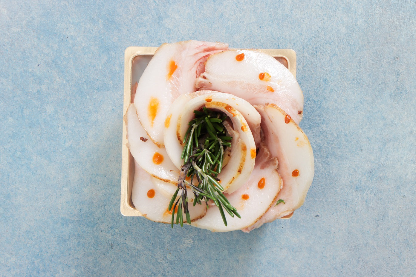 ロゼドロティドポー 雲丹のドット:低温調理ローストポークの薔薇仕立て 練り雲丹をドットに見立てて。