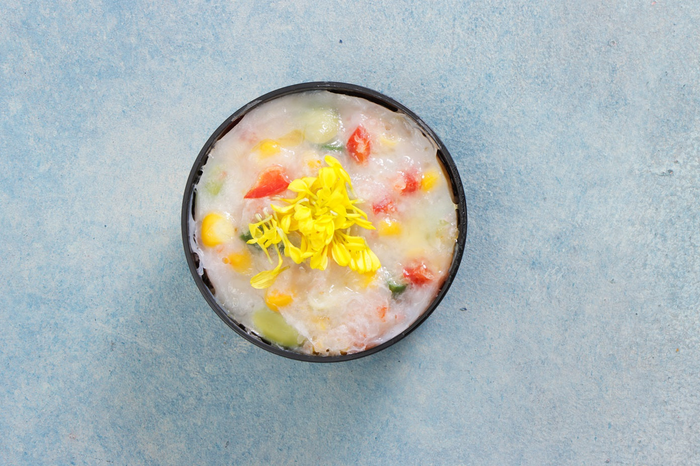 海老と初夏野菜の真丈:とうもろこしや枝豆などを入れた海老ムース 和出汁ジュレ。