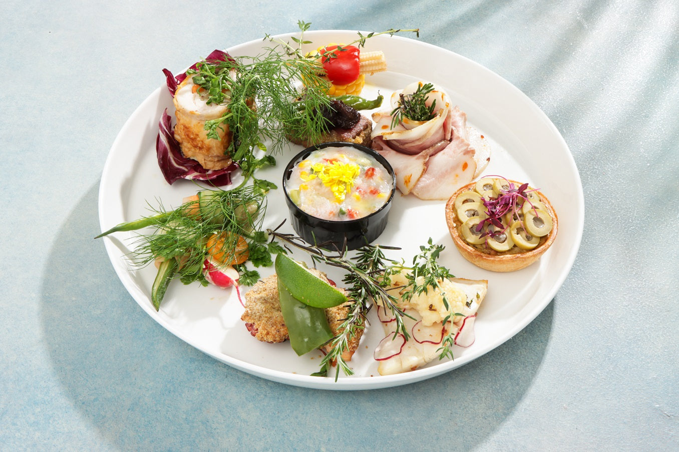 フランス料理をベースに、ジャパンクラフトを意識し和の要素を散りばめたオードブルセット。魚、肉はもちろん初夏の野菜を使い、バランスの取れたメニューです。