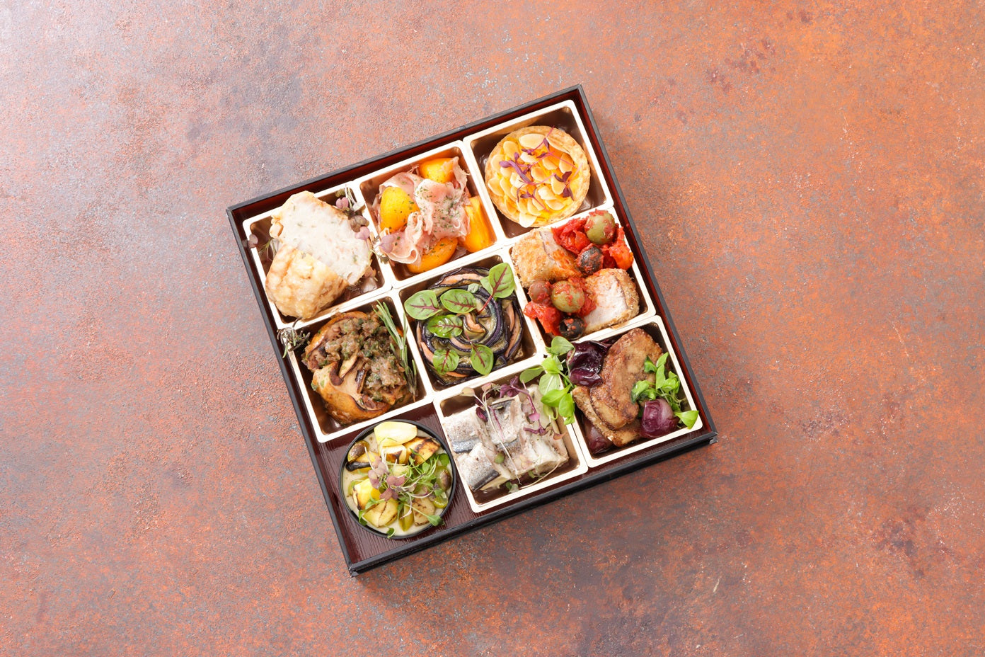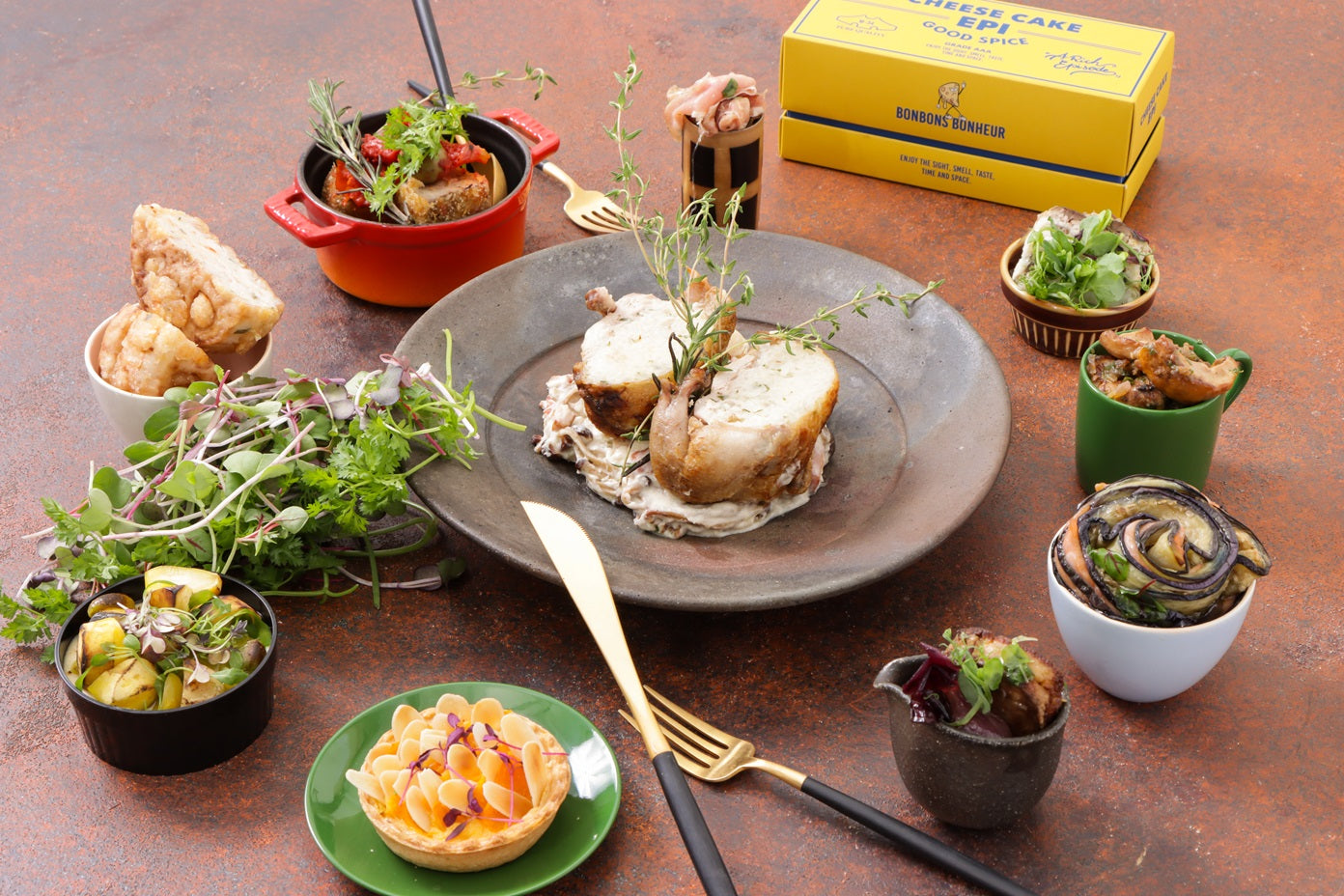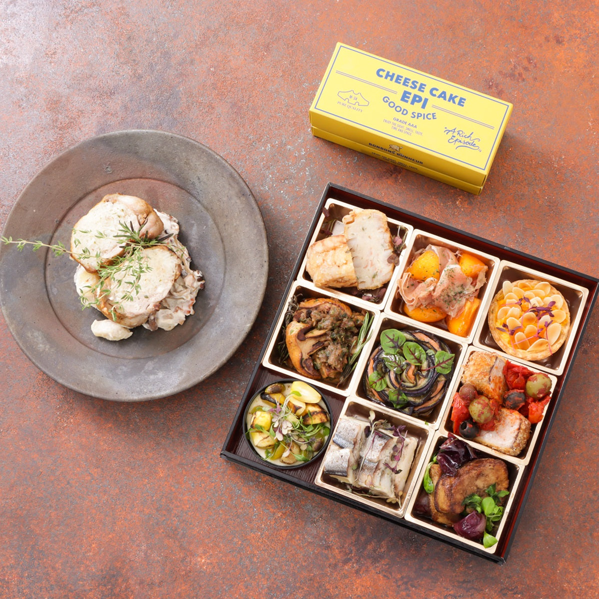 「和」を基調としたモダンフレンチケータリングUN-BE LABから生まれる月替わり「to-un-be」オードブルとCHEESECAKE「EPI」のドルチェセット。