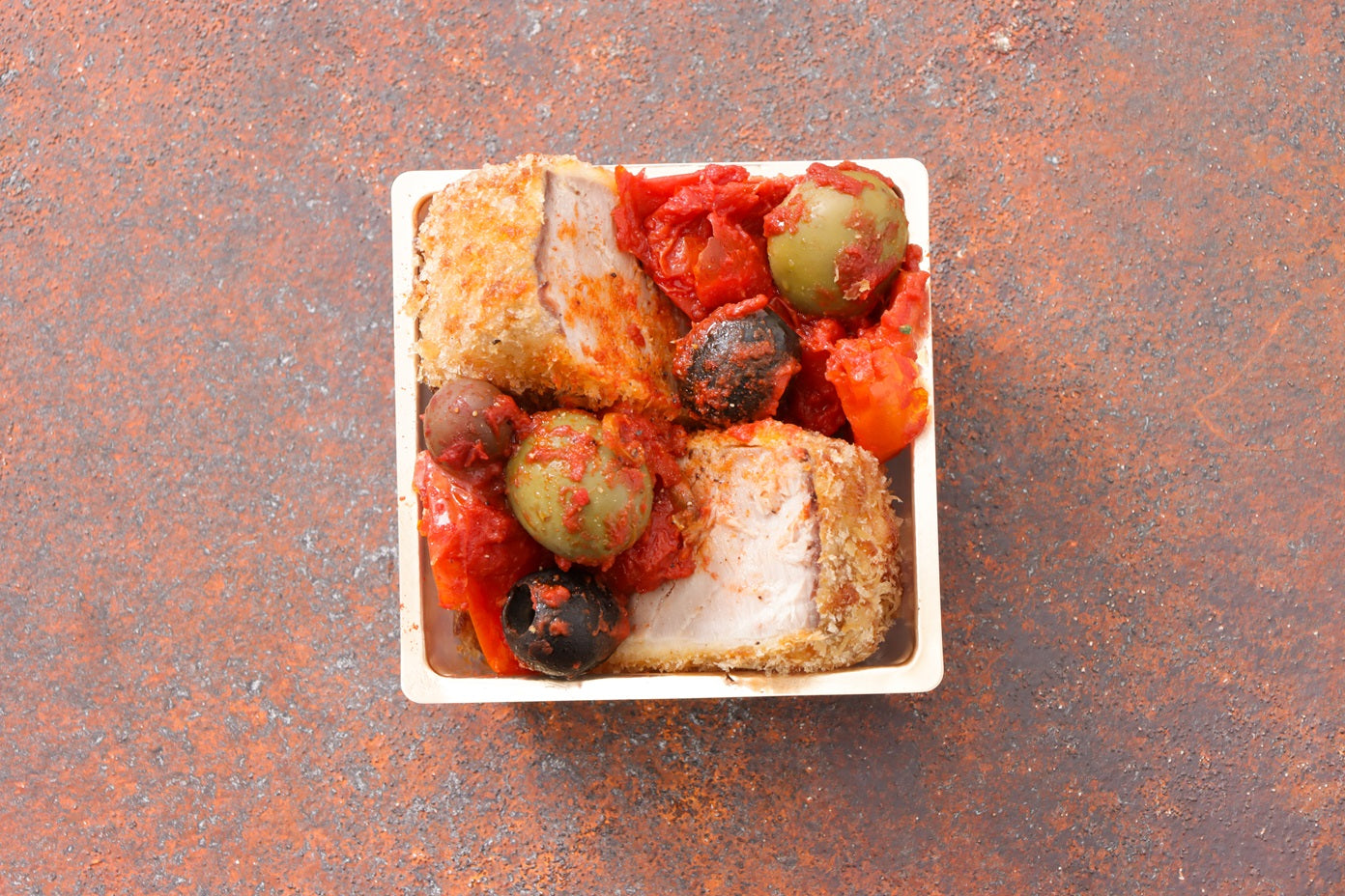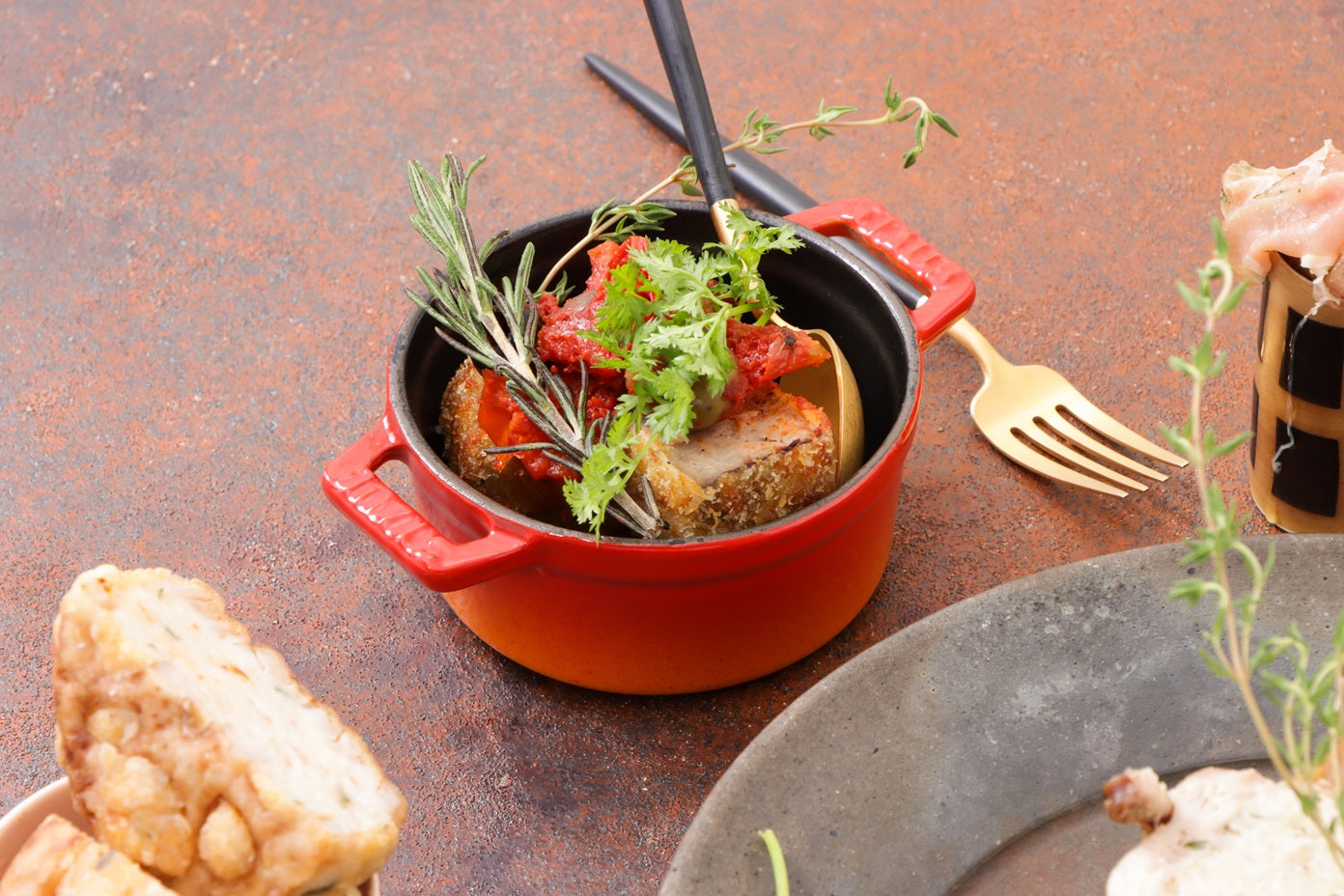 戻りカツオのコートレット マルミタコ風:南西地方のマルミタコ(漁師料理)を意識したトマト煮風ソース