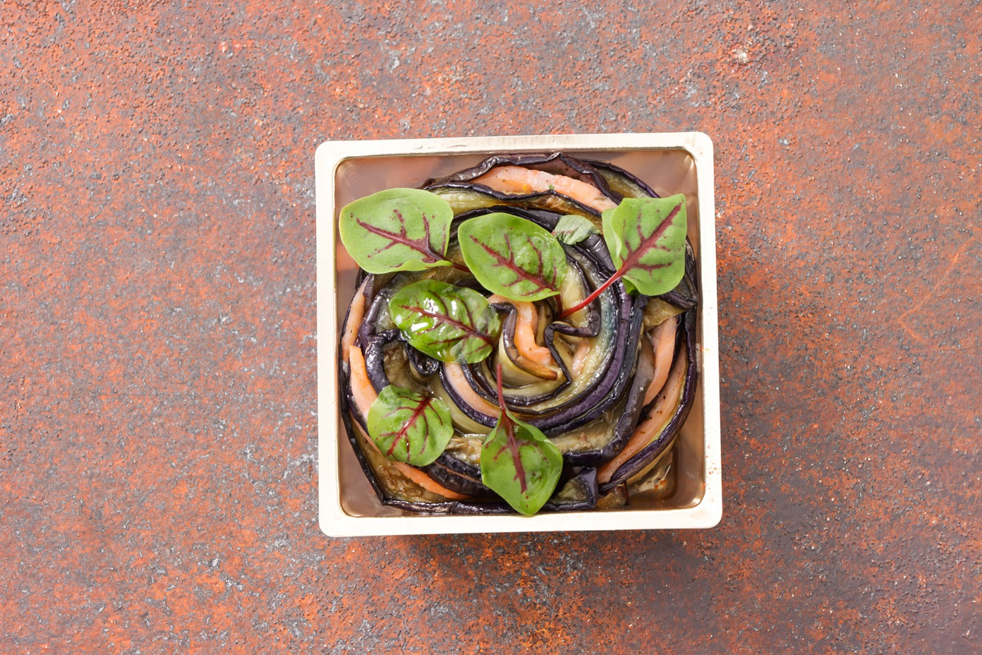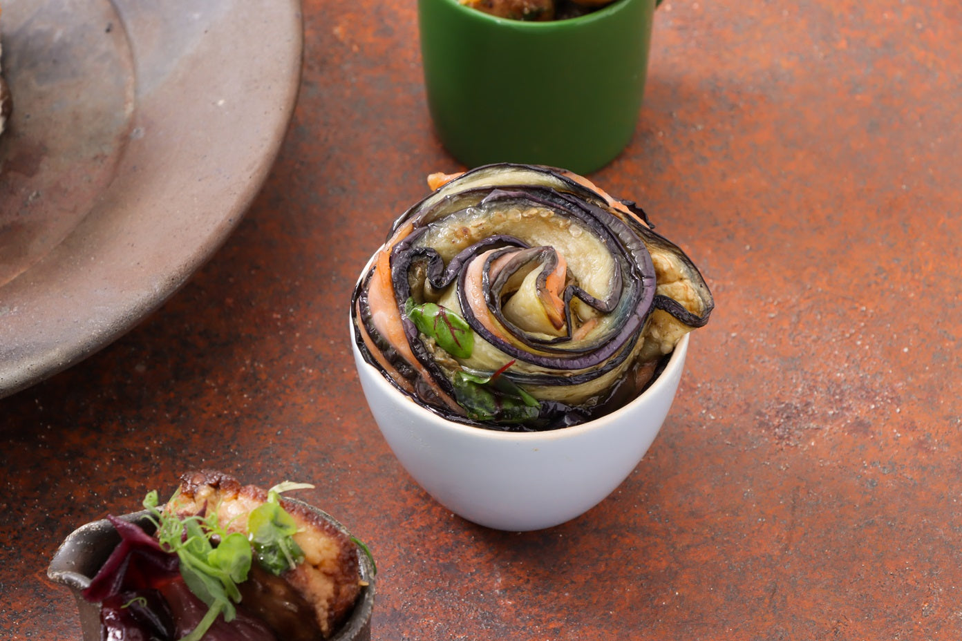 焼き茄子とサーモンのルーロ:数種のハーブでローストしたスライス茄子とサーモンのマリネを共に巻いてロティした一品