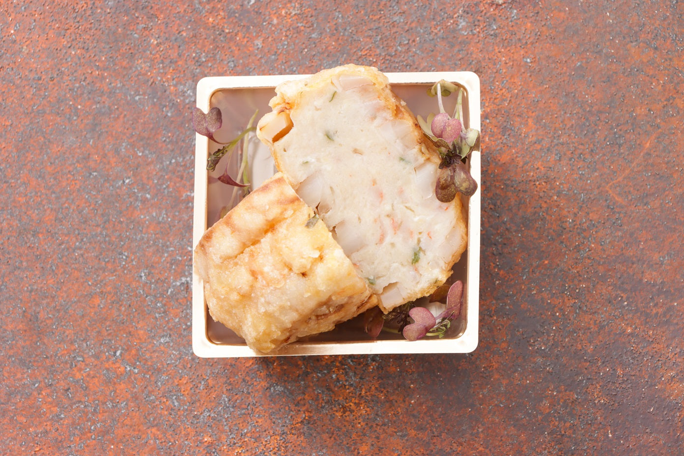 若鶏と海老のムース 蓮根フリット:軽やかな海老ムースを蓮根に挟んで揚げました