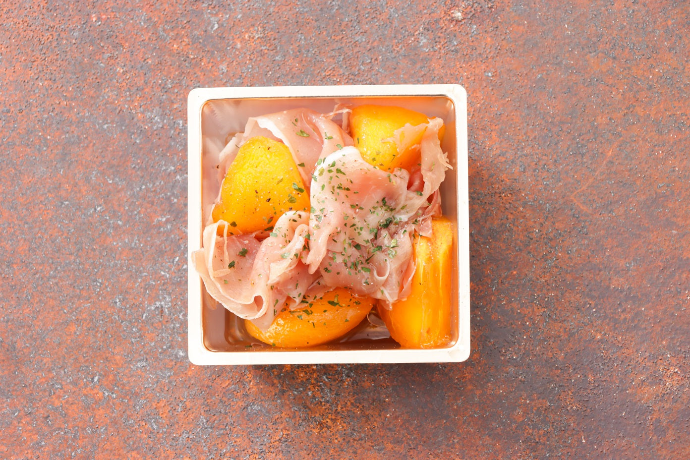 柿のマセレ ハモンセラーノ:ブランデー、仏産サトウキビでマリネした柿とイベリコハムを合わせました
